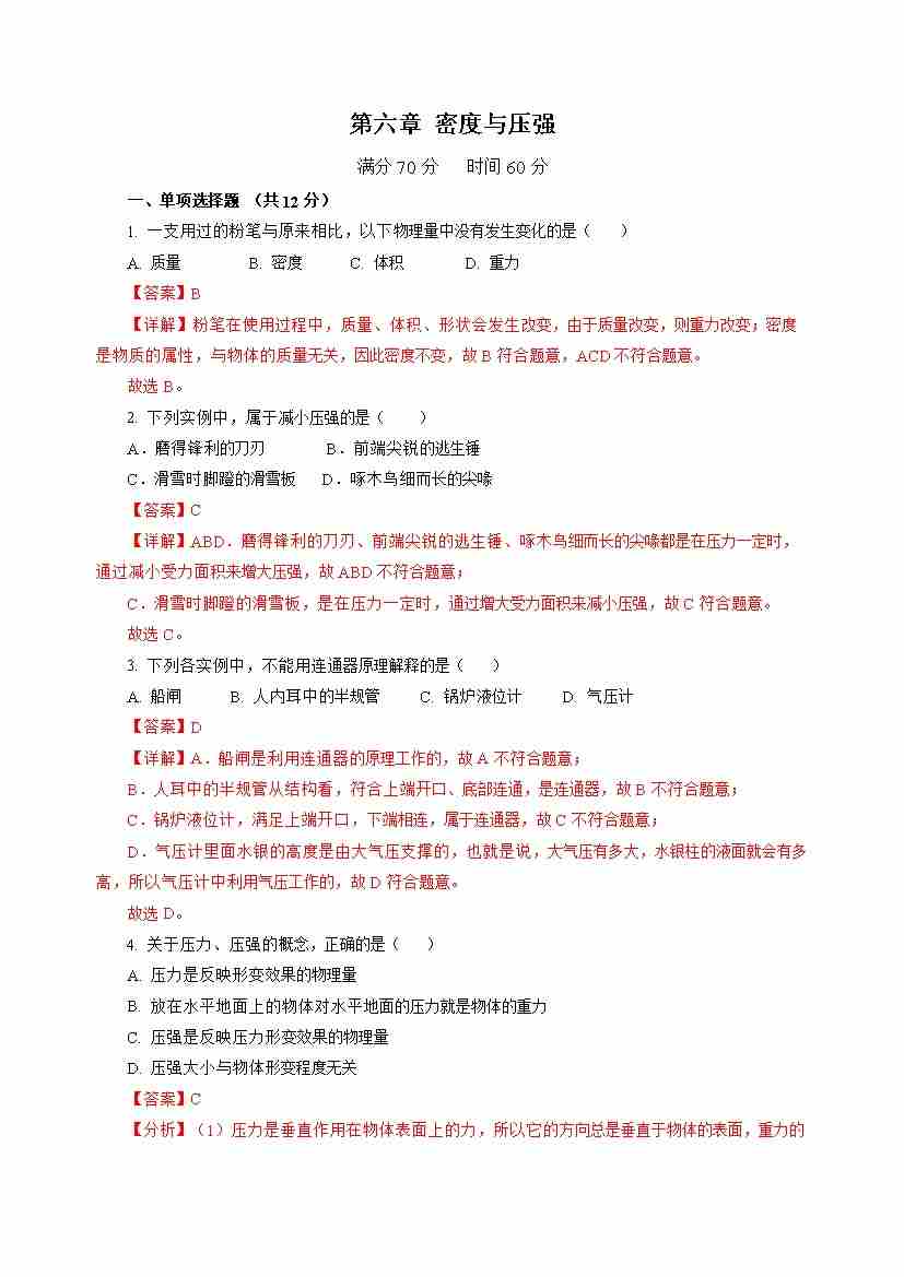 第6章 密度与压强(单元自测卷)(解析版)