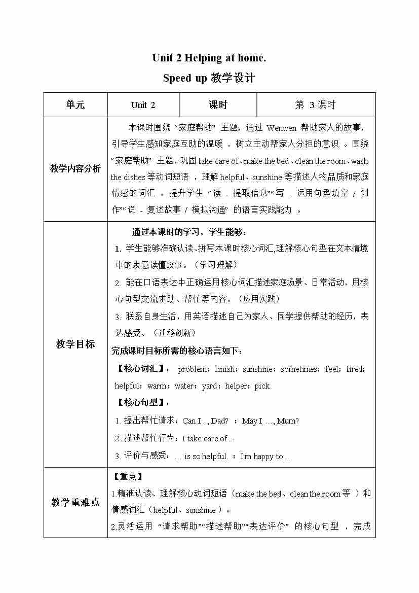 Unit 2 第3课时 Speed up(教学设计)英语外研版三起四年级上册(新教材)