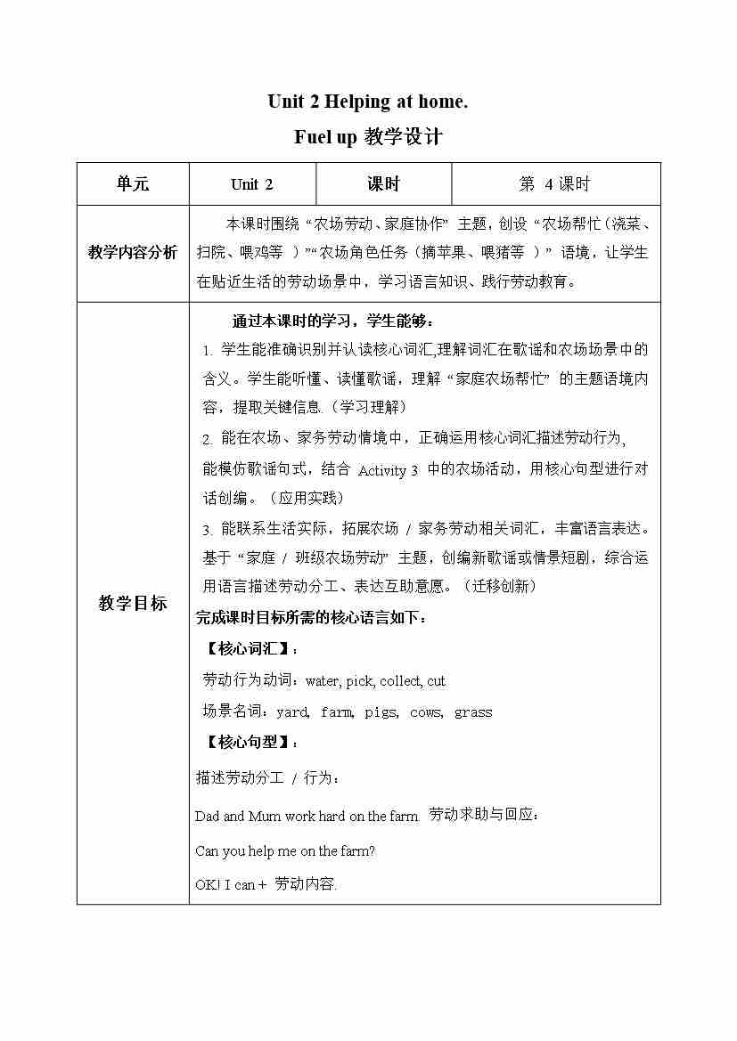 Unit 2 第4课时 Fuel up(教学设计)英语外研版三起四年级上册(新教材)