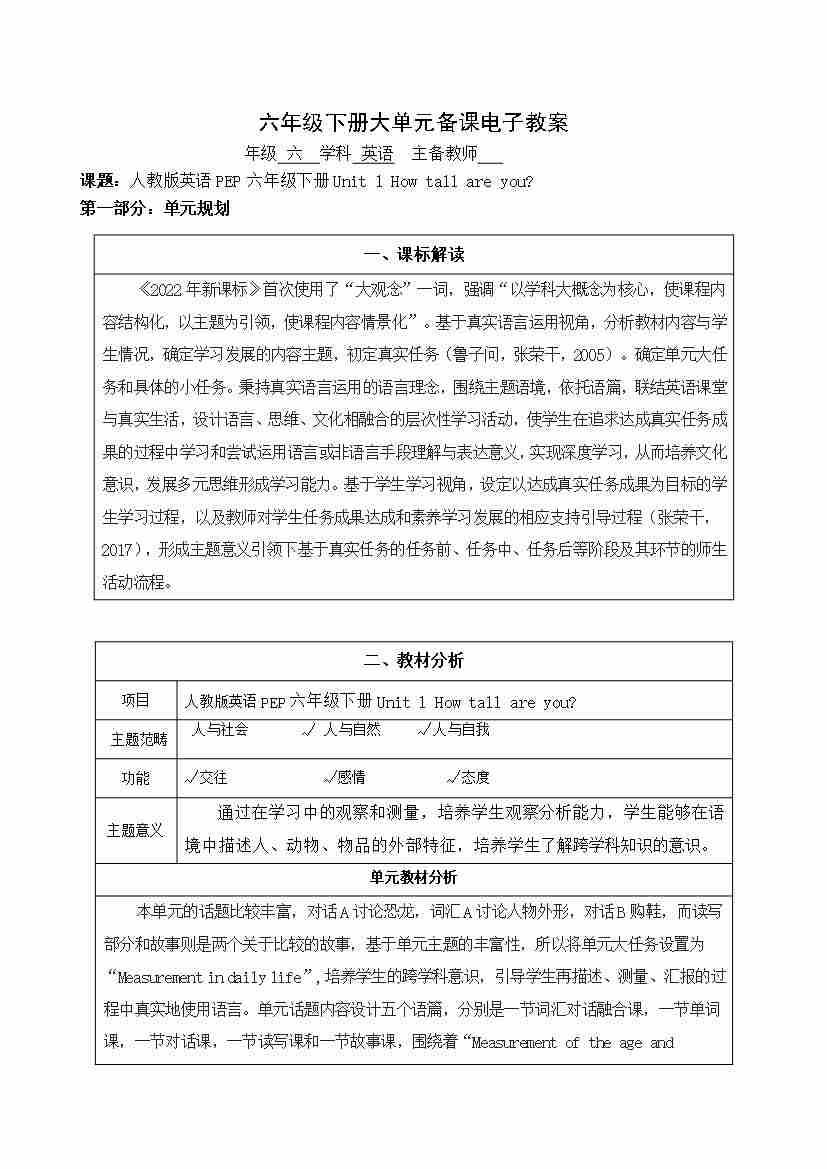 Unit 1 How tall are you 大单元整体(教案)