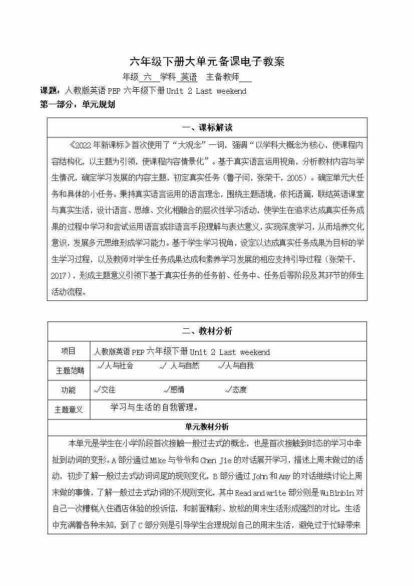 Unit 2 Last weekend 大单元整体(教案)