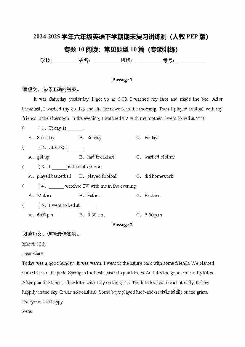 专题10 阅读:常见题型10篇(专项训练)-(人教PEP版)