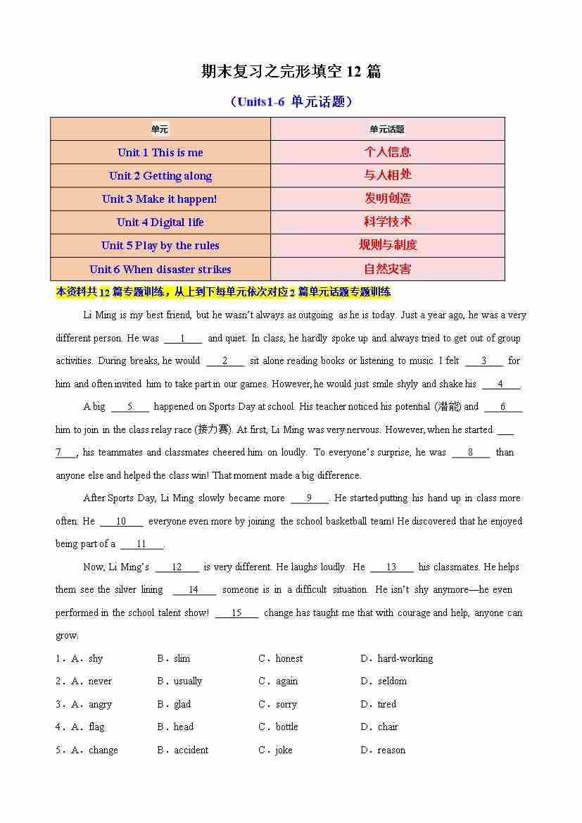 期末复习之完形填空12篇(Units1-6单元话题)(解析版)