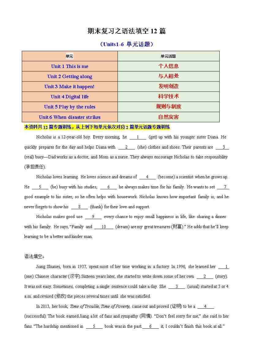 期末复习之语法填空12篇(Units1-6单元话题)(原卷版)