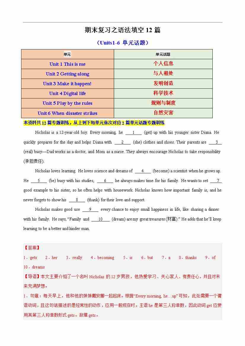 期末复习之语法填空12篇(Units1-6单元话题)(解析版)