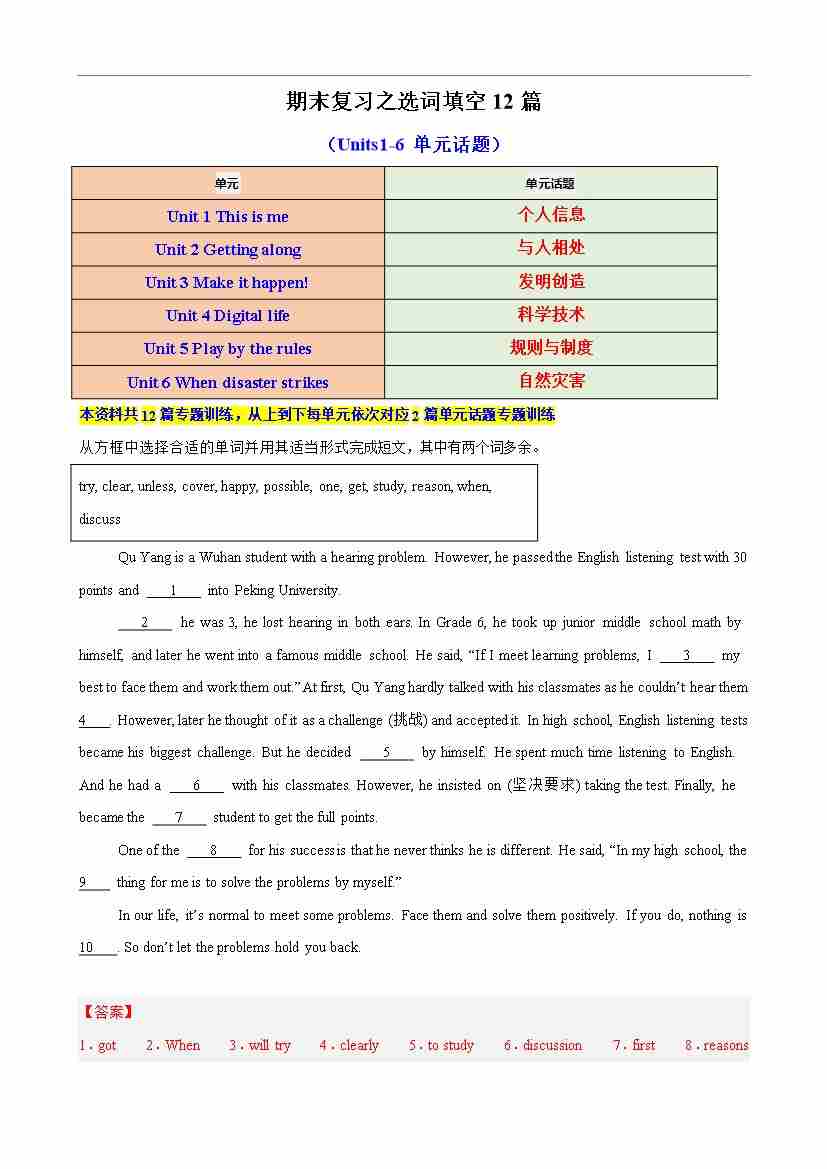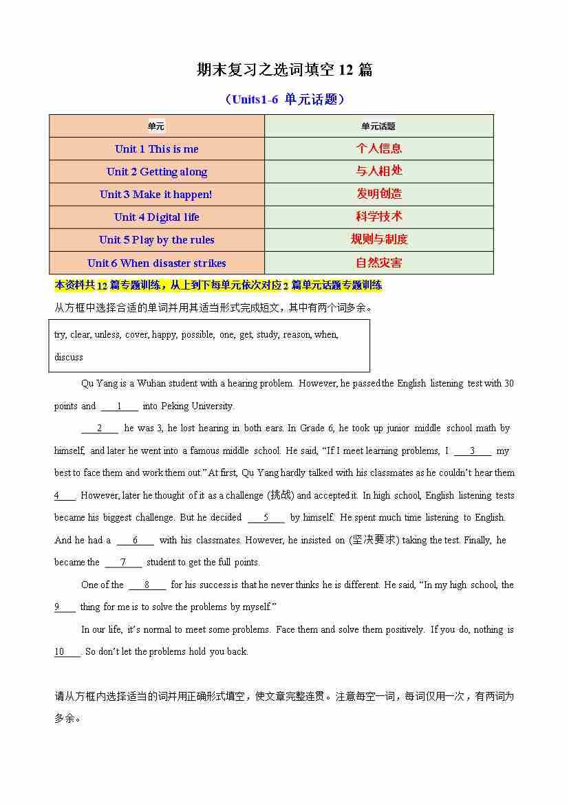 期末复习之选词填空12篇(Units1-6单元话题)(解析版)