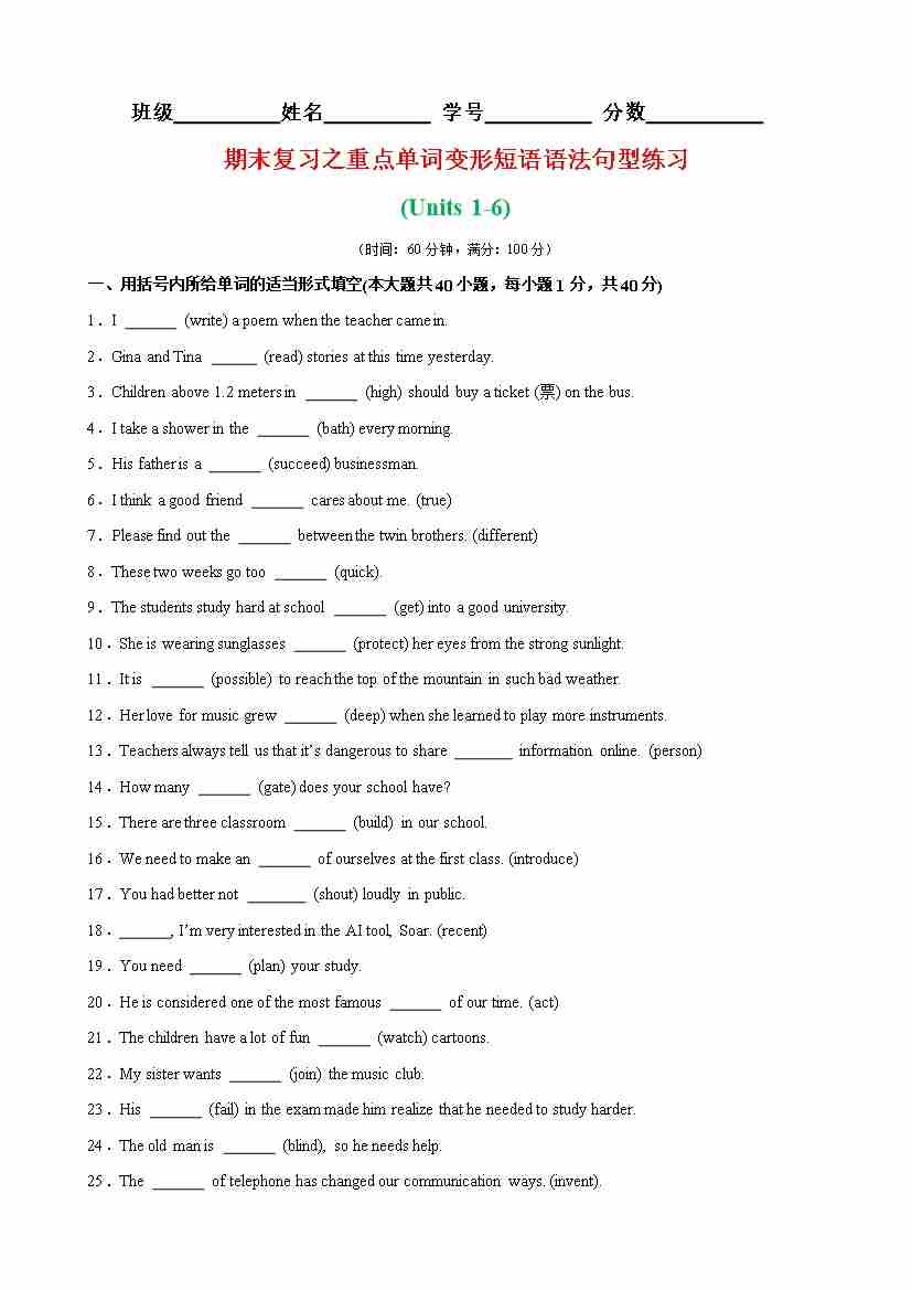 期末复习之重点单词,词性转换,短语,语法,句型练习(Units 1-6)(原卷版)