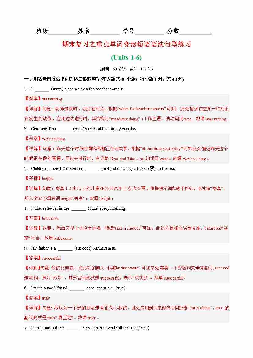 期末复习之重点单词,词性转换,短语,语法,句型练习(Units 1-6)(解析版)