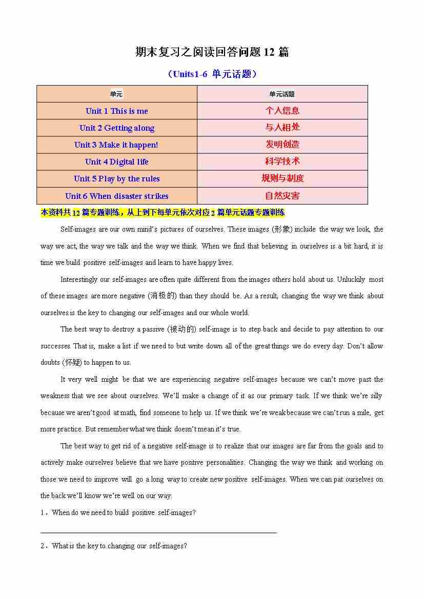 期末复习之阅读回答问题12篇(Units1-6单元话题)(原卷版)