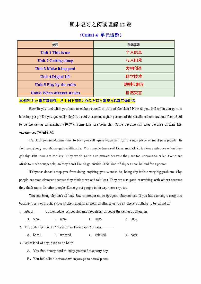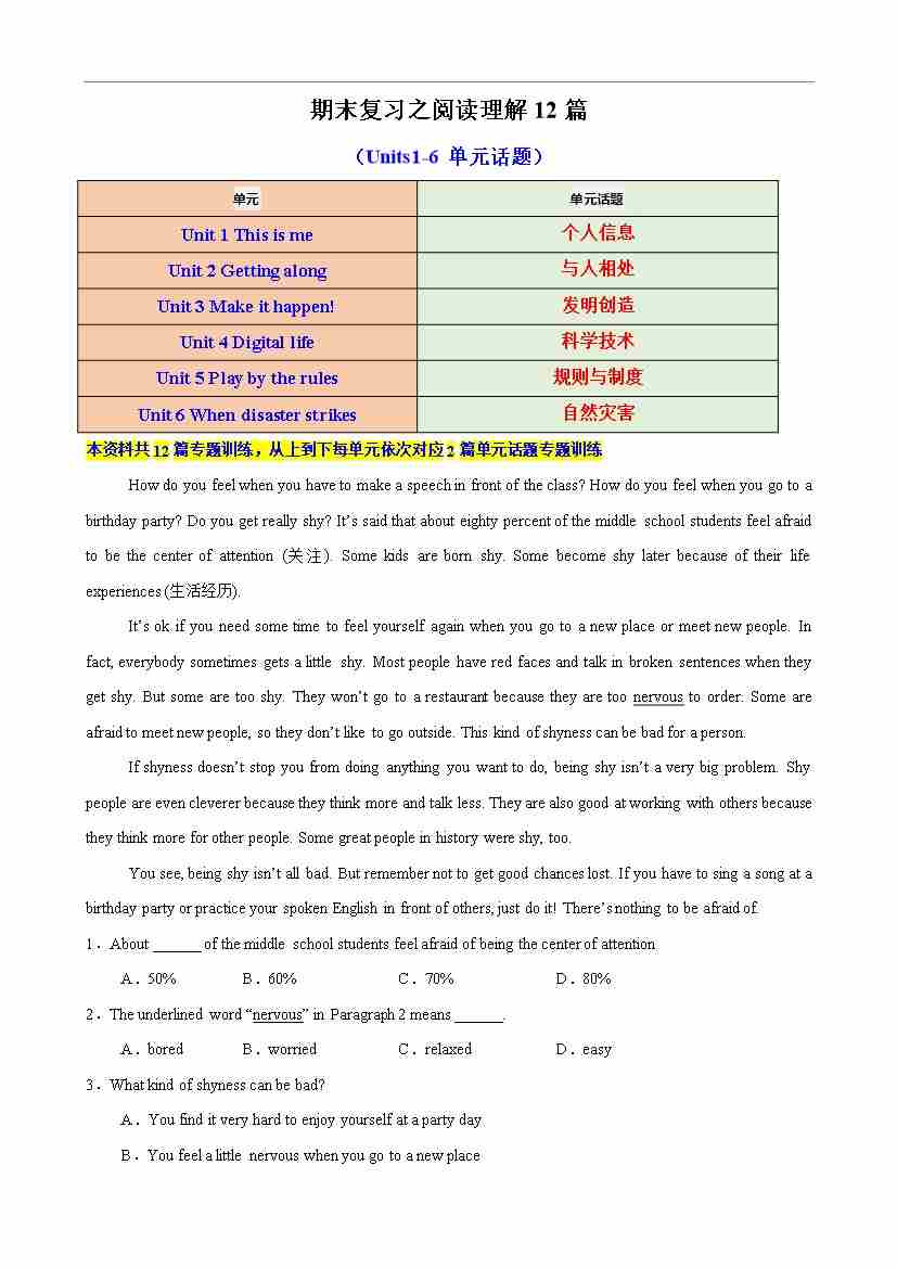 期末复习之阅读理解12篇(Units1-6单元话题)(原卷版)