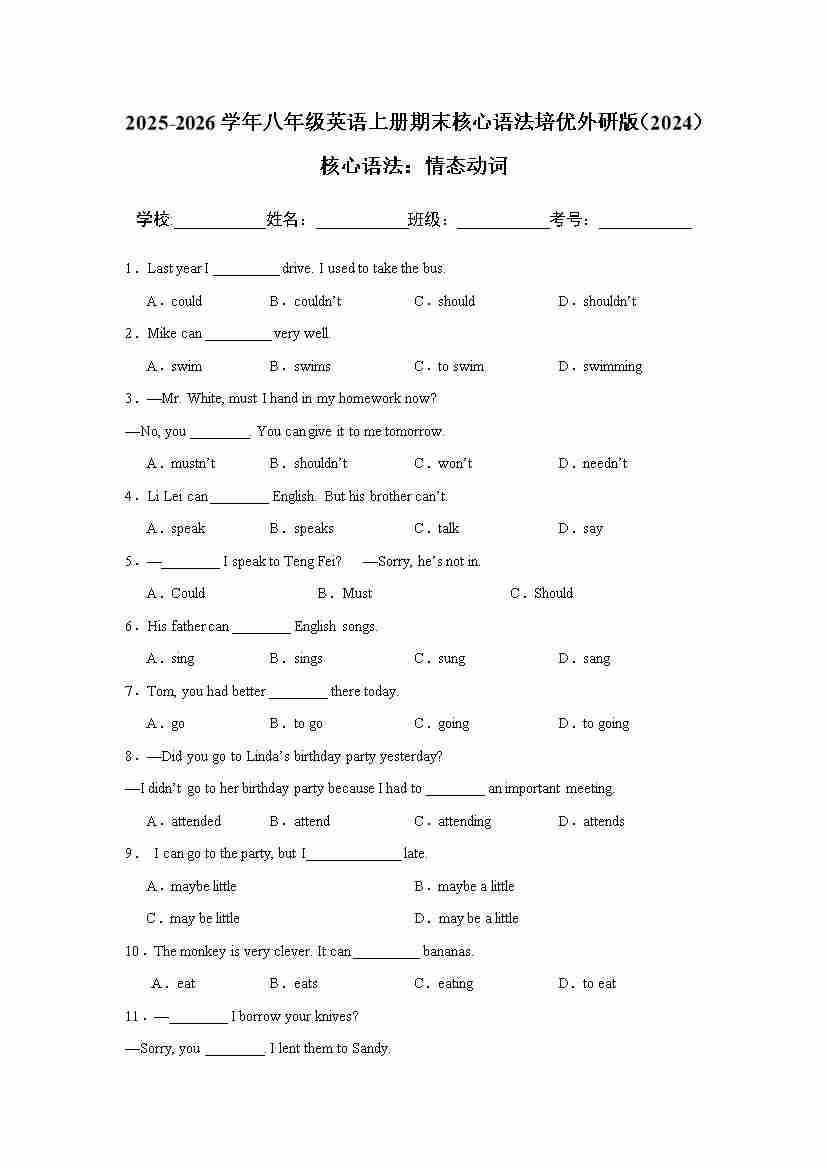 情态动词 25秋八上英语外研版