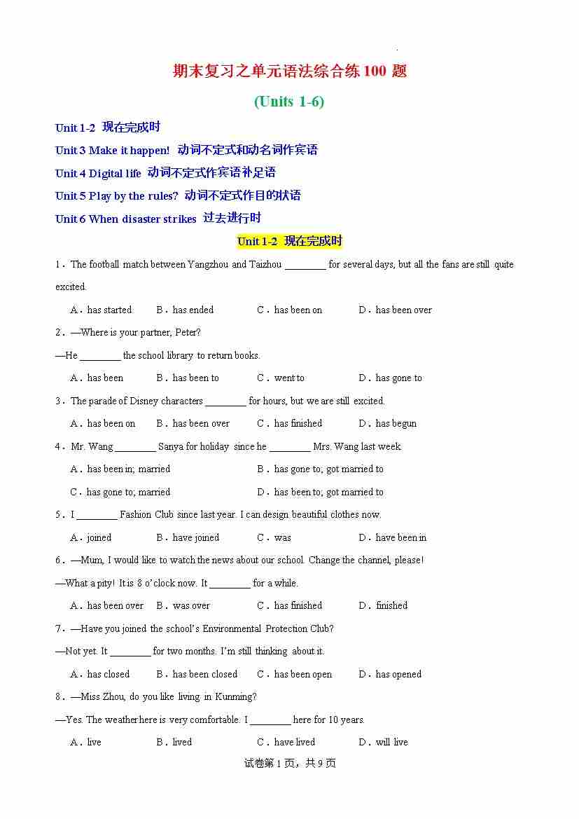 期末复习之单元语法综合练100题(Units 1-6)(原卷版)