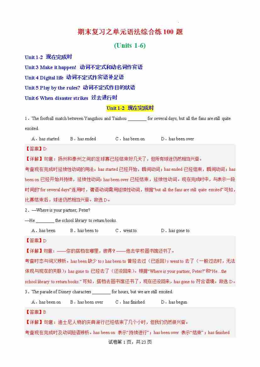 期末复习之单元语法综合练100题(Units 1-6)(解析版)