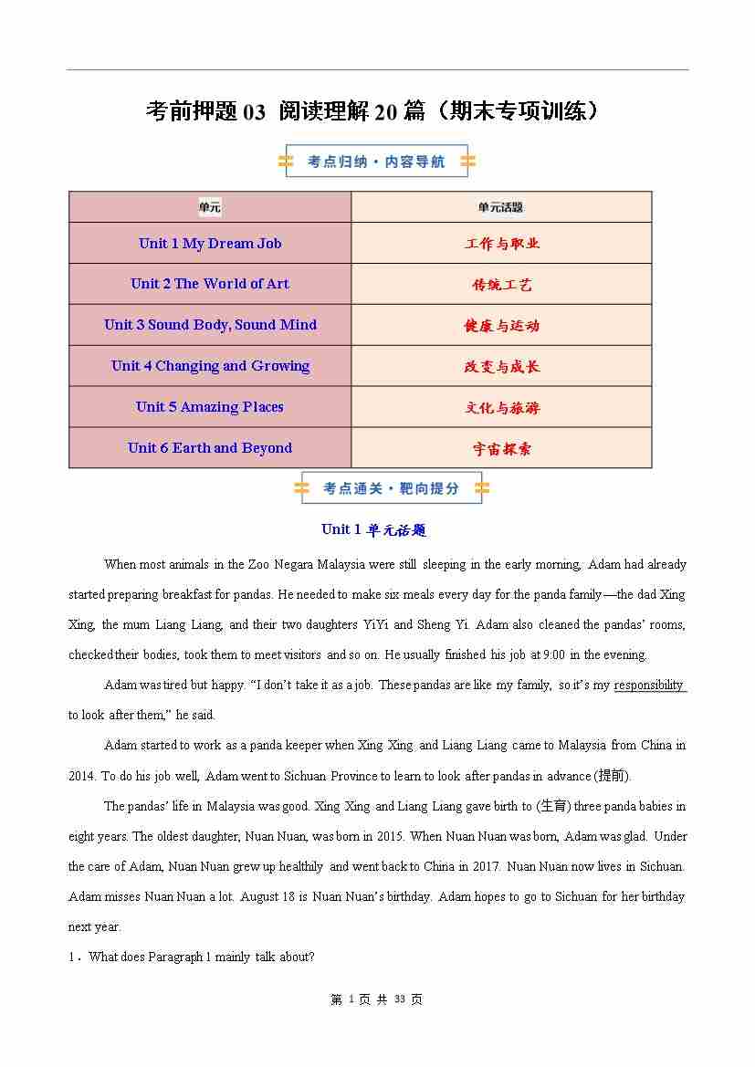 考前押题03 阅读理解20篇(期末专项训练)(解析版)