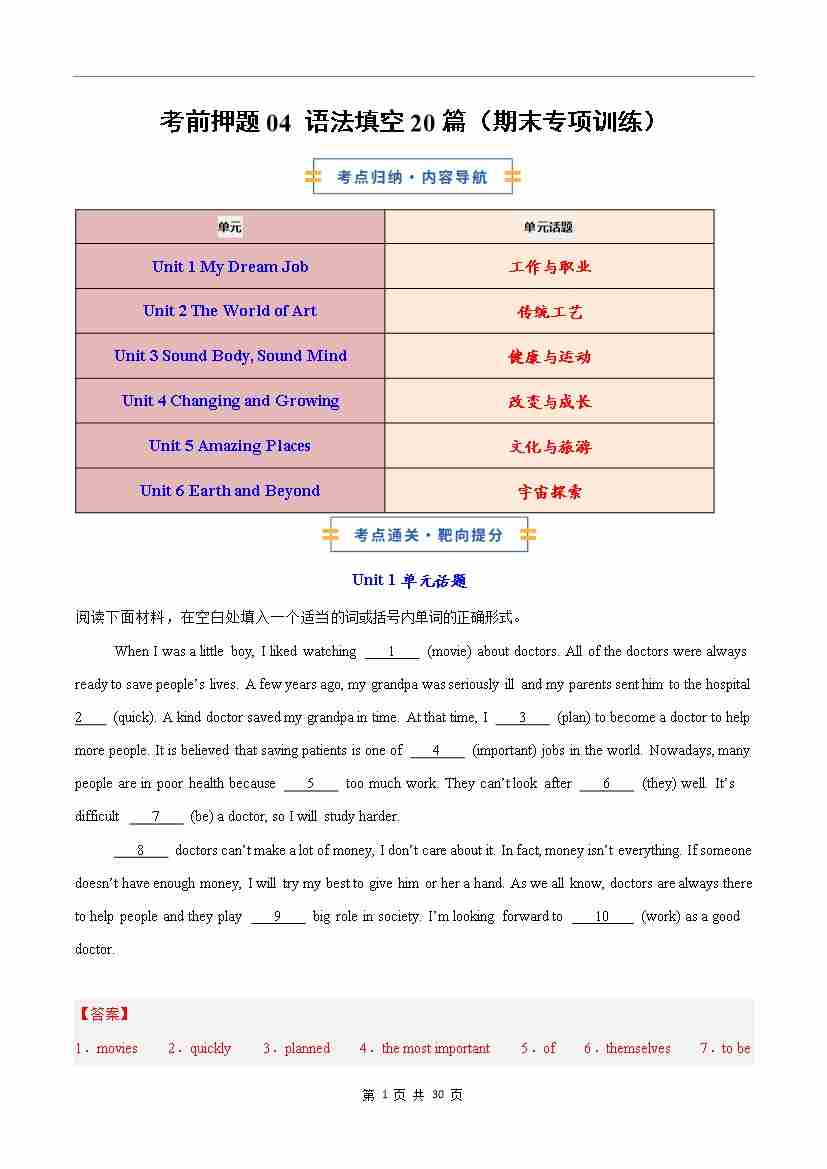 考前押题04 语法填空20篇(期末专项训练)(解析版)