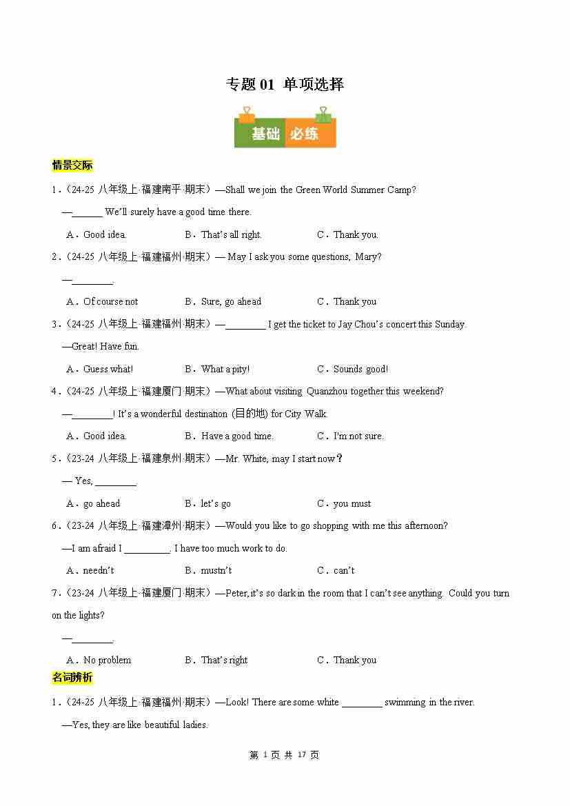专题01 单项选择(期末真题汇编,福建专用)(原卷版)