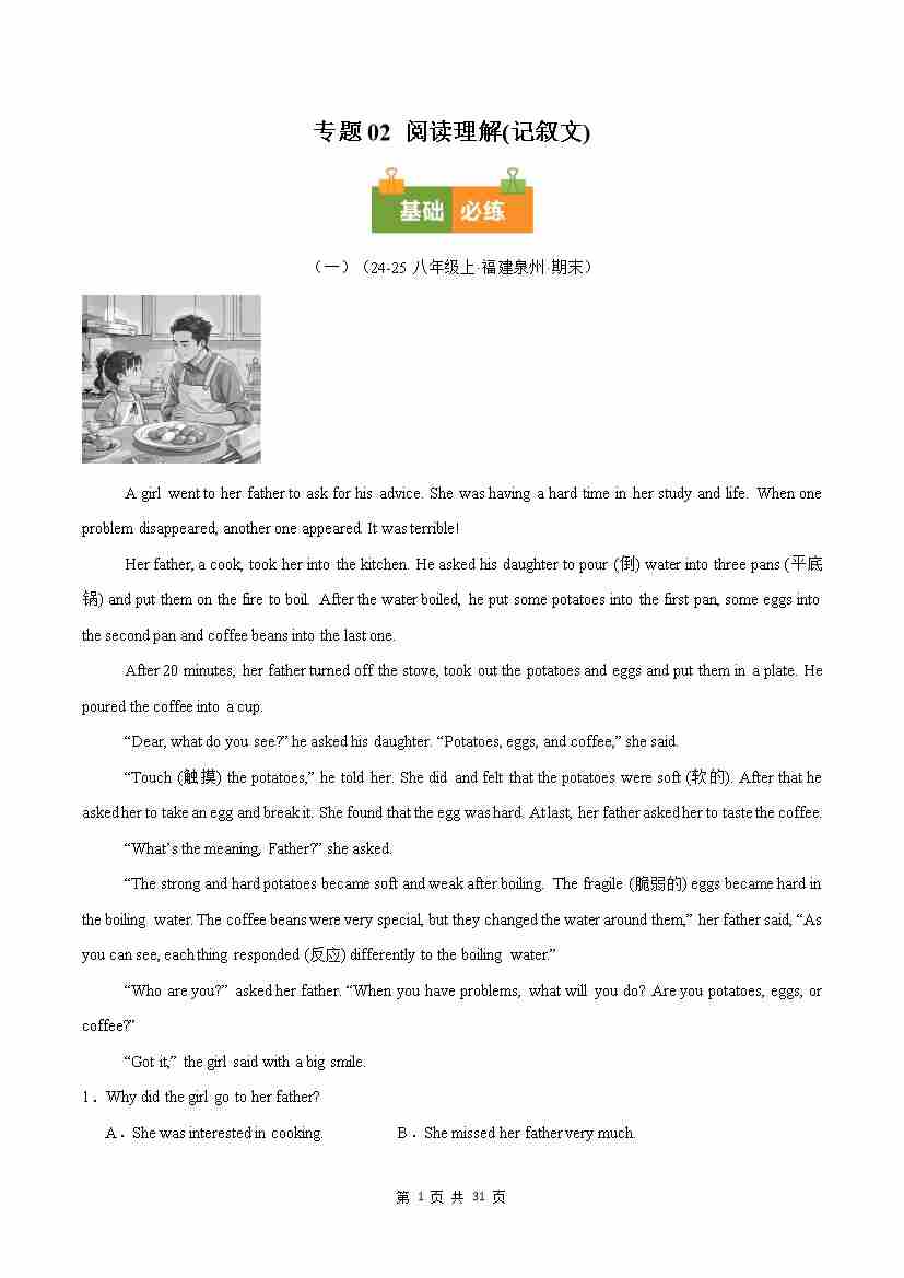 专题02 阅读理解(记叙文)(期末真题汇编,福建专用)(解析版)