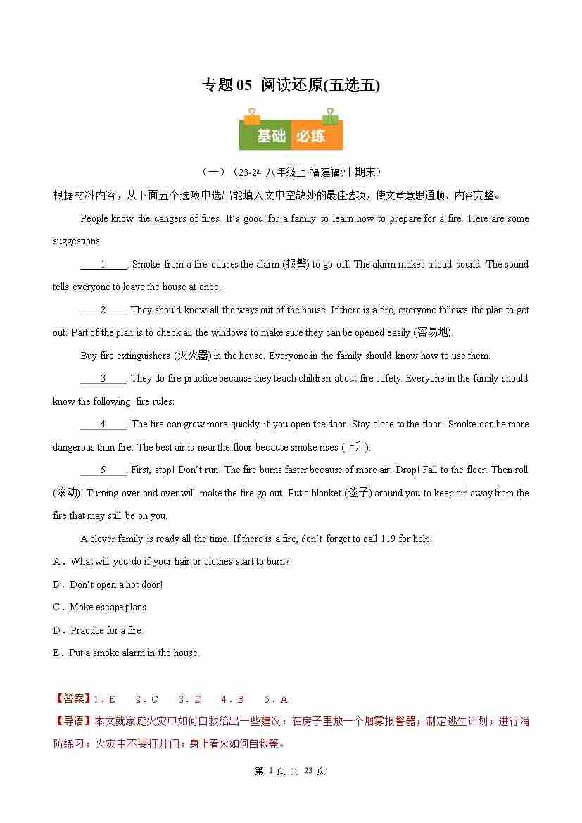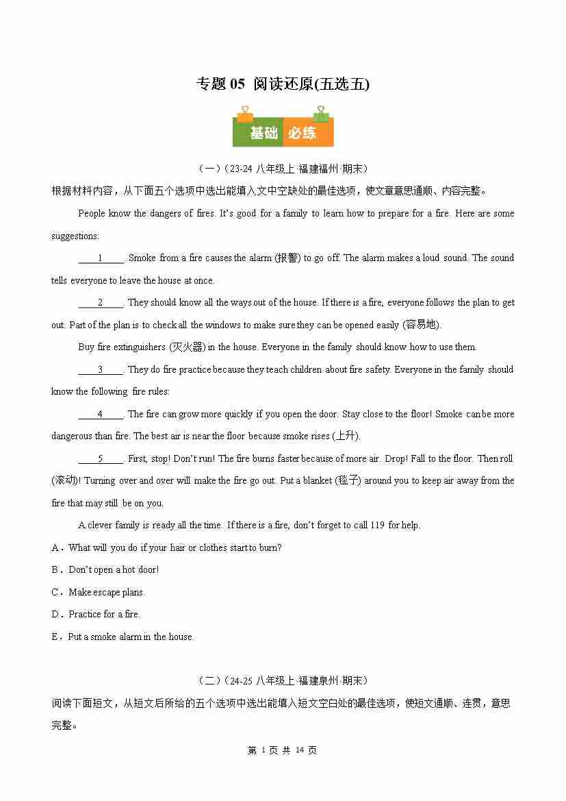 专题05 阅读还原(五选五)(期末真题汇编,福建专用)(原卷版)