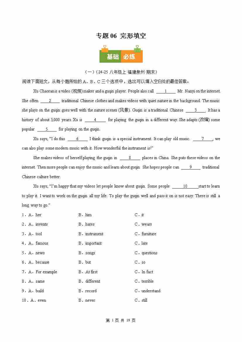 专题06 完形填空(期末真题汇编,福建专用)(原卷版)