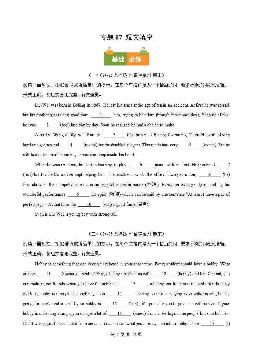 专题07 短文填空(期末真题汇编,福建专用)(解析版)