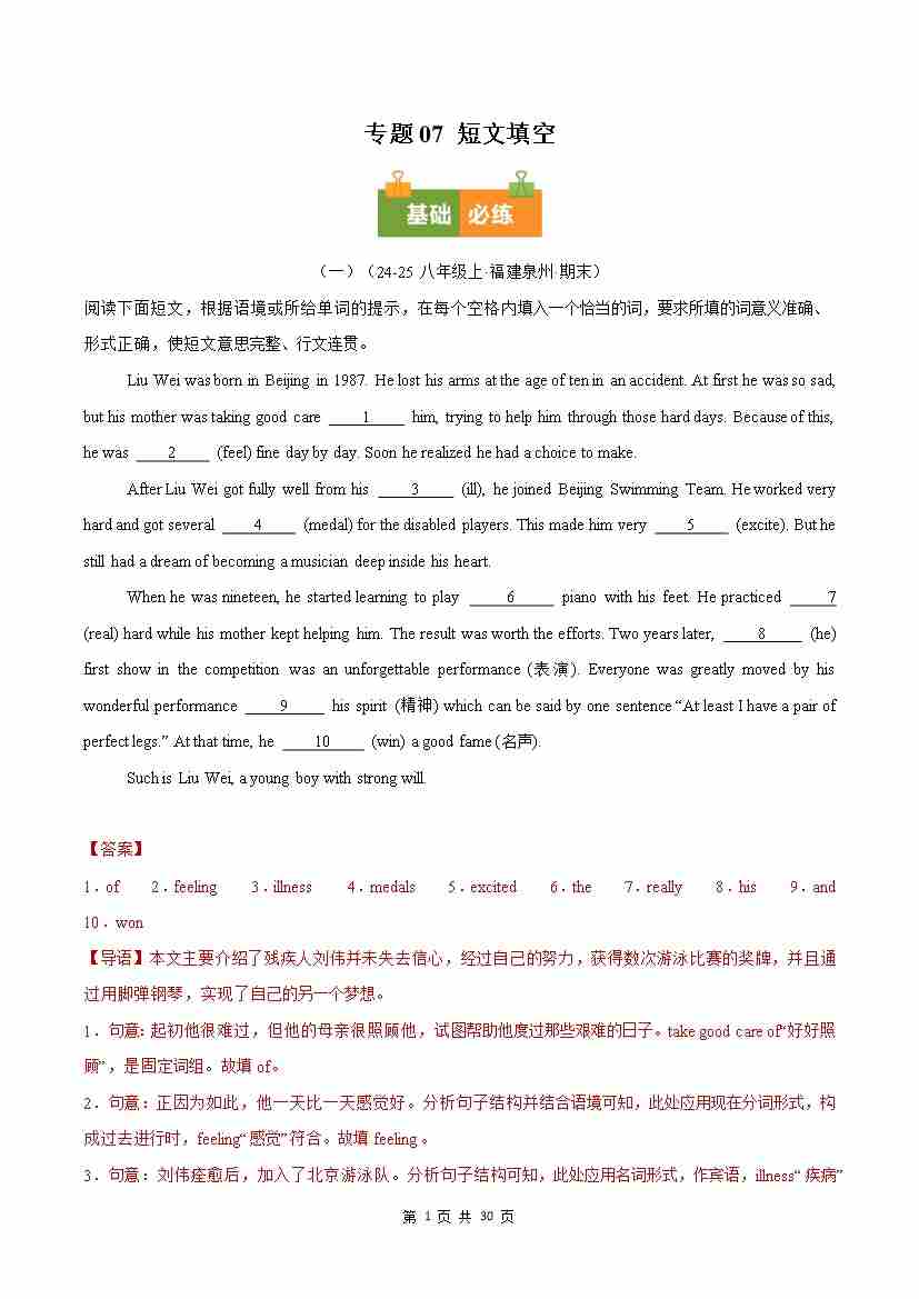 专题06 完形填空(期末真题汇编,福建专用)(解析版)
