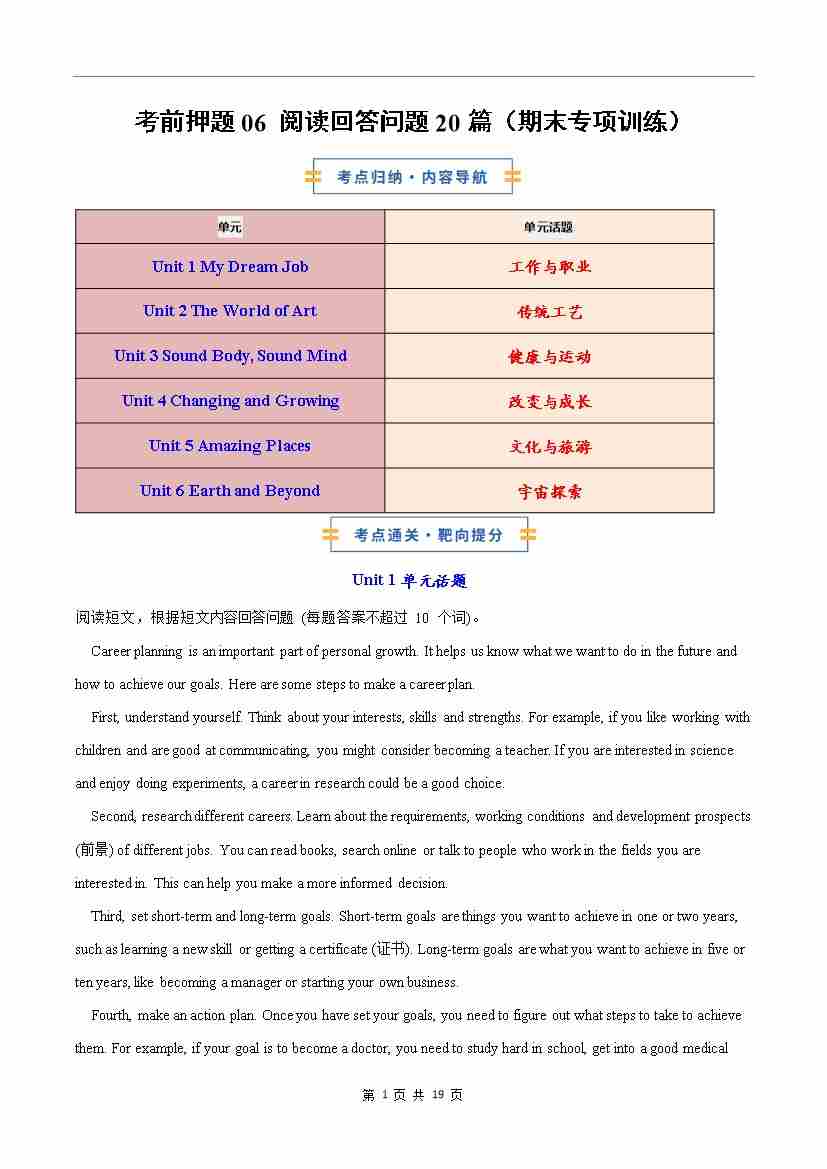 考前押题06 阅读回答问题20篇(期末专项训练)(原卷版)