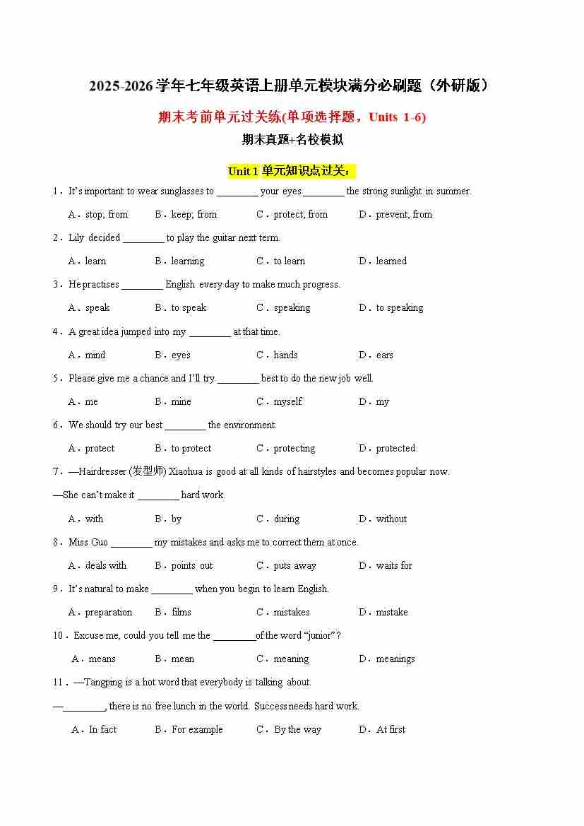 期末考前单元过关练(单项选择题,Units 1-6)(原卷版)(外研版)6