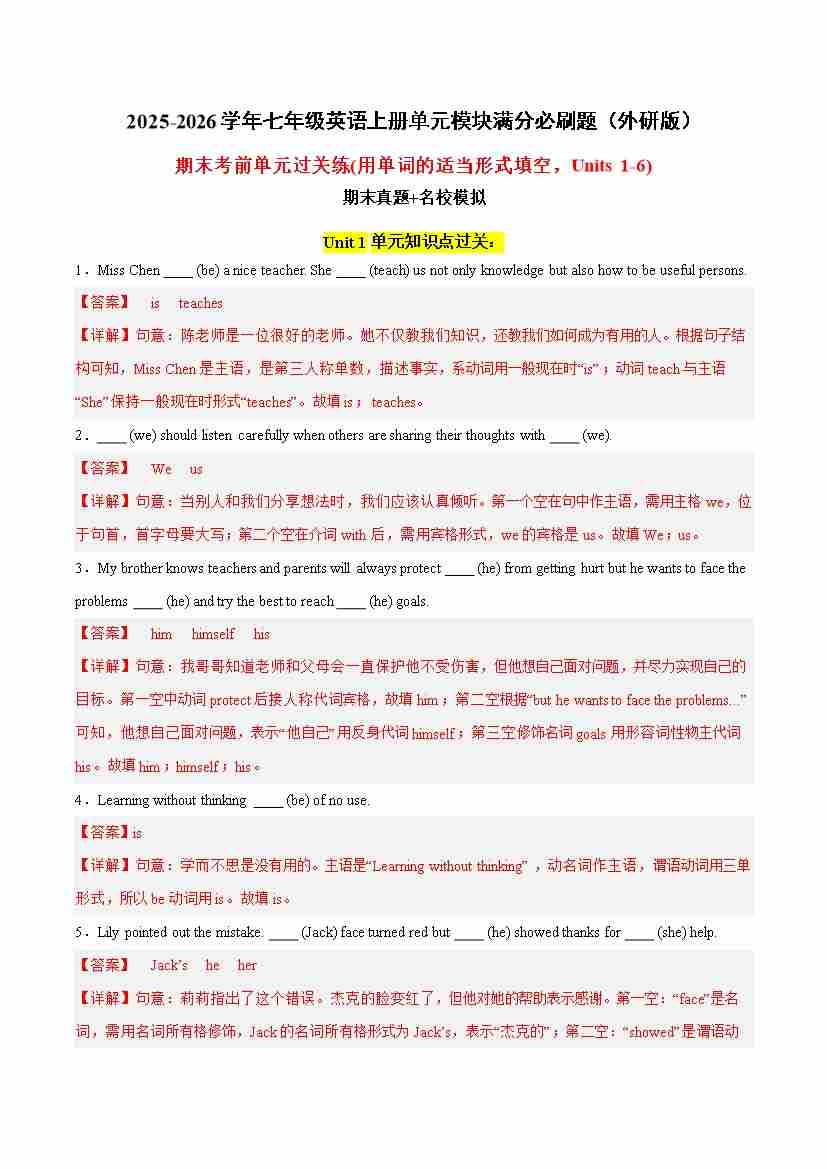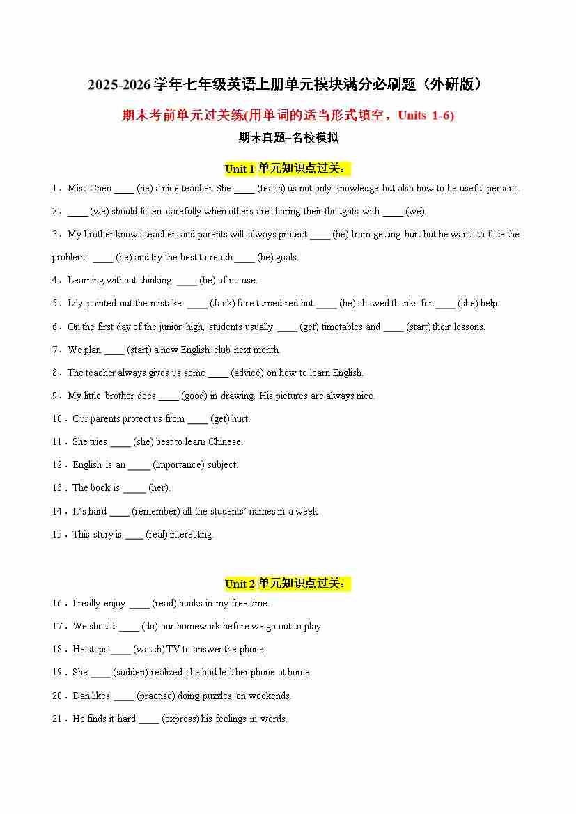 期末考前单元过关练(用单词的适当形式填空,Units 1-6)(解析版)(外研版)