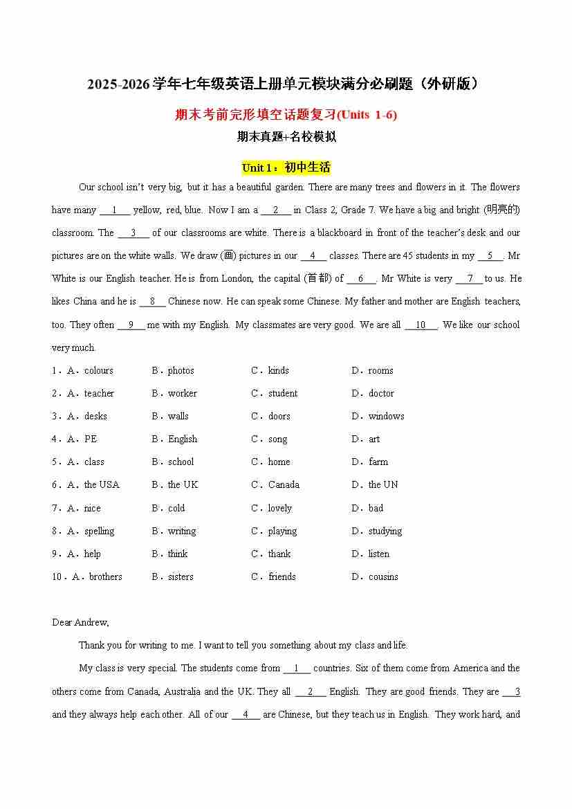 期末复习之完形填空12篇(Units1 6单元话题)(外研版2024)