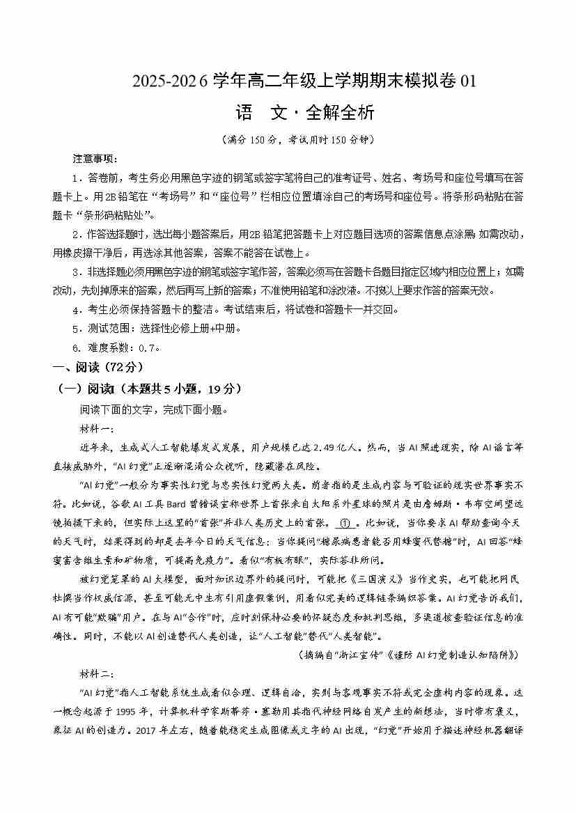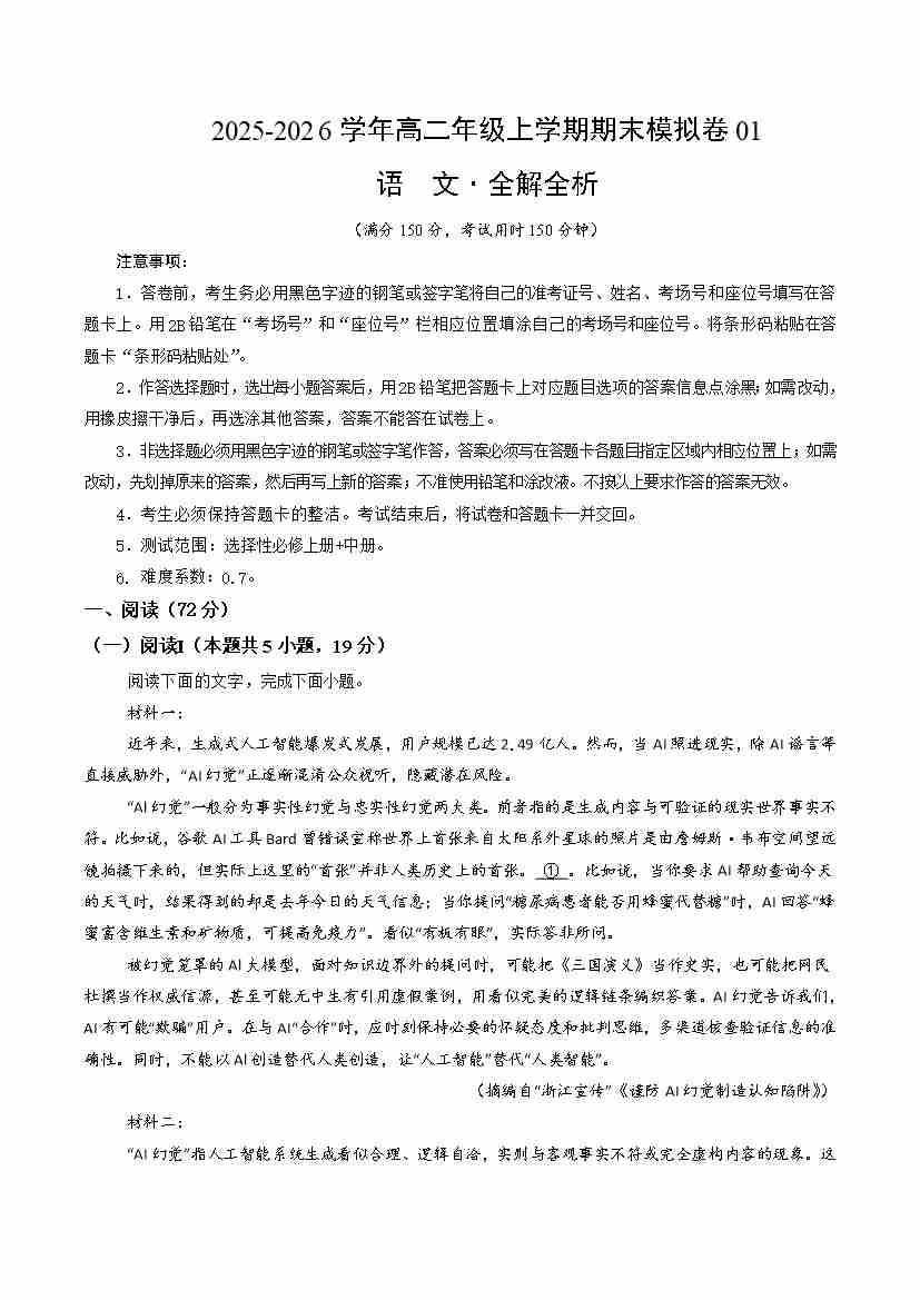 高二语文上学期期末模拟卷01(统编版2026)(全解全析)
