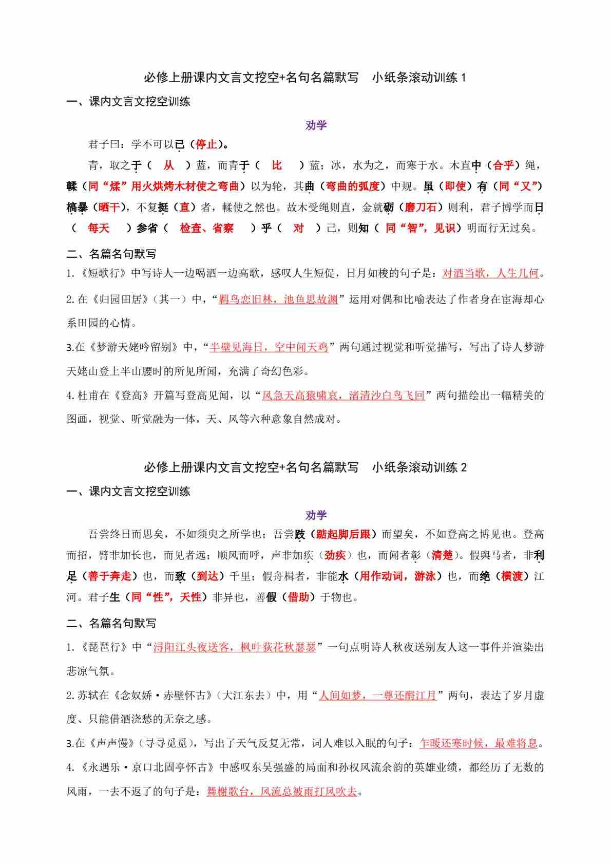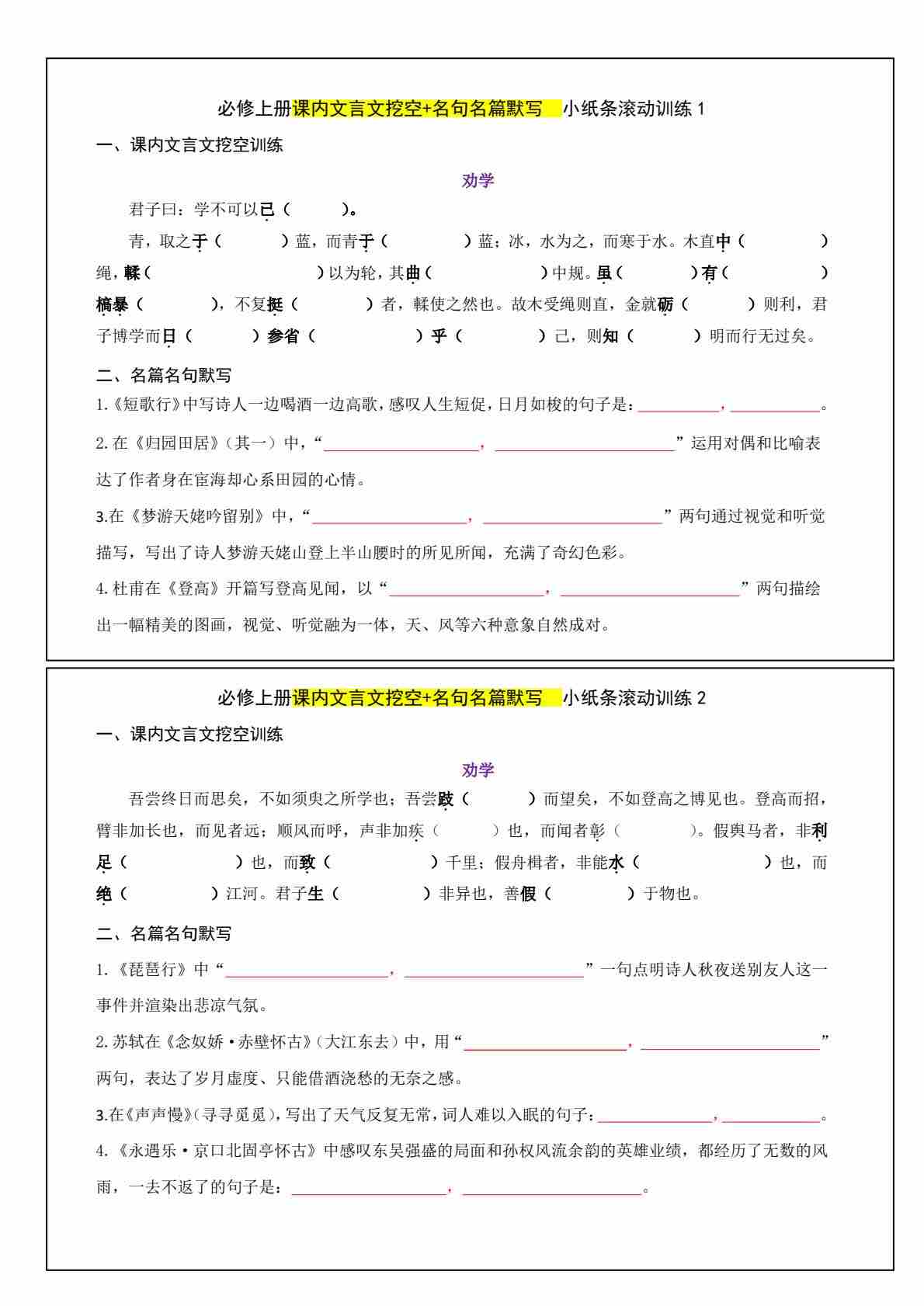 (训练版)必修上册课内文言文挖空 名句名篇默写小纸条滚动训练