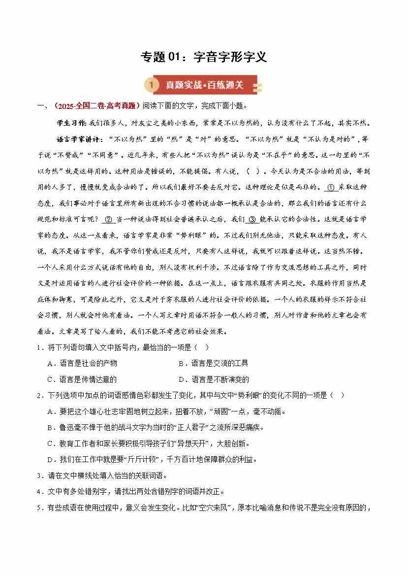 专题01字音字形字义(期末复习讲义) (原卷版)