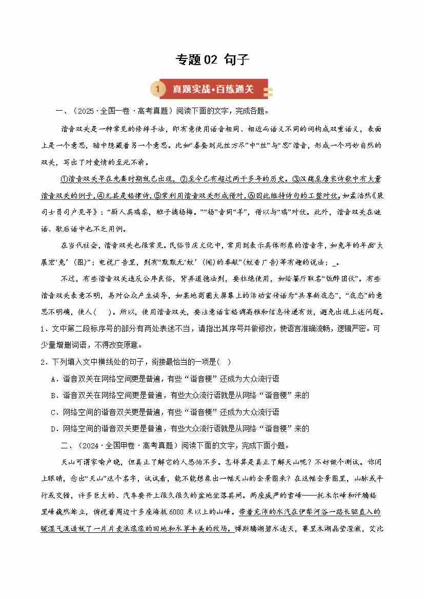 专题02 句子(期末专项训练)(原卷版)