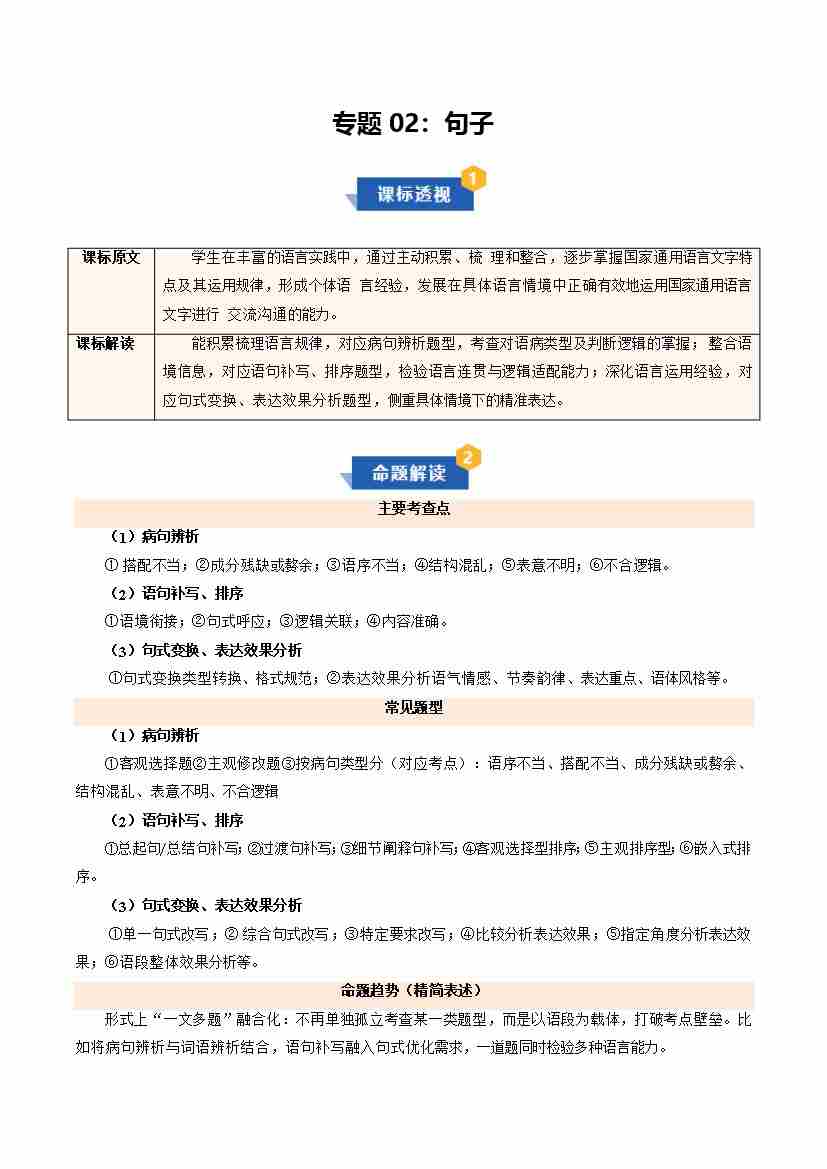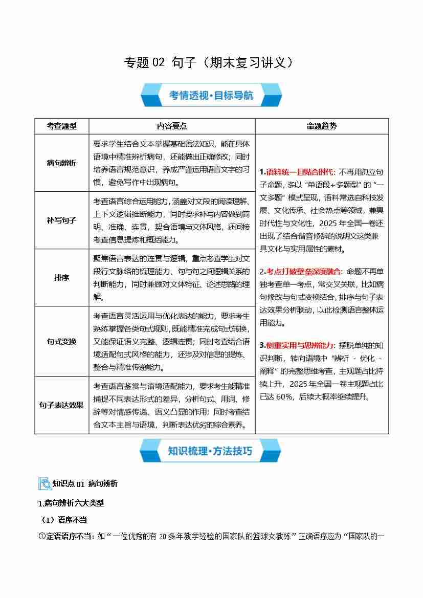 专题02 句子(期末复习讲义) (原卷版)
