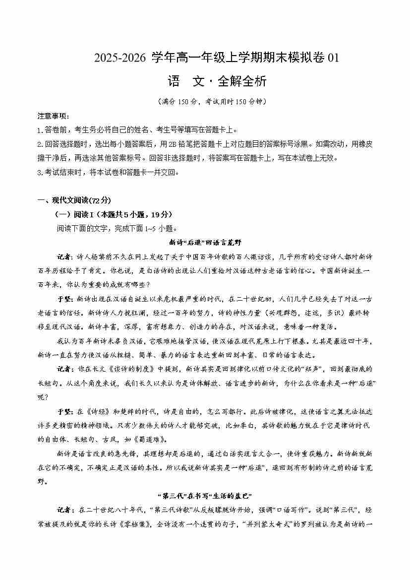 高一语文上学期期末模拟卷01(新教材统编版)(全解全析)