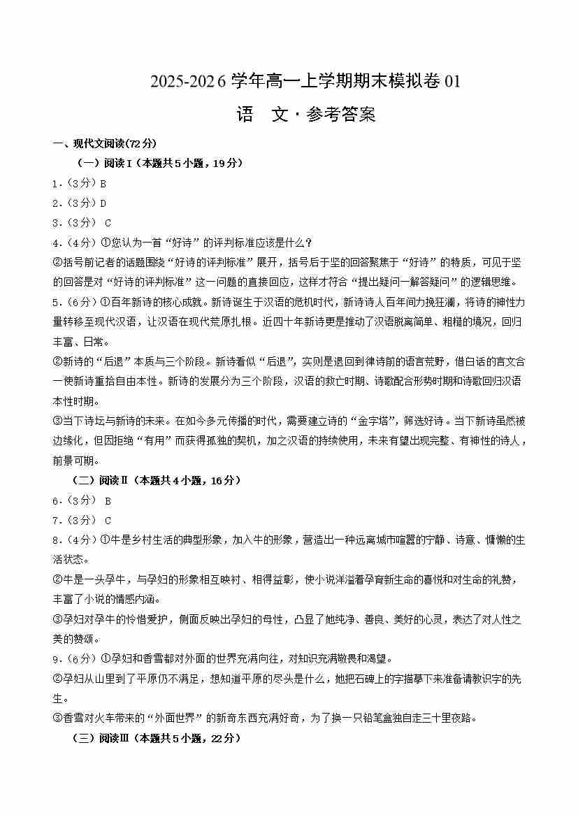 高一语文上学期期末模拟卷01(新教材统编版)(参考答案)