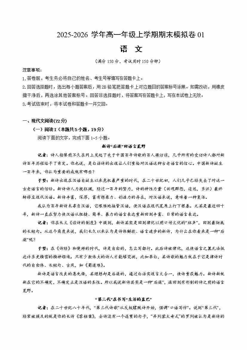 高一语文上学期期末模拟卷01(新教材统编版)(考试版A4)
