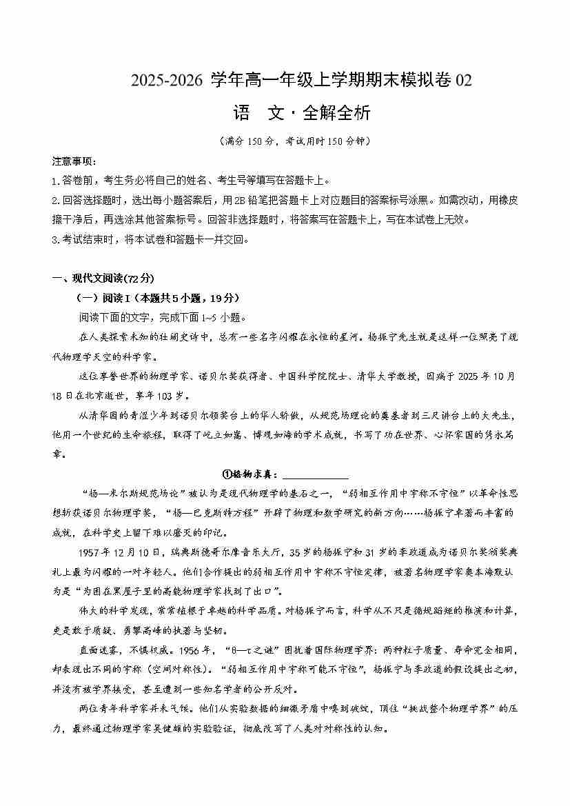 高一语文上学期期末模拟卷02(新教材统编版)(全解全析)