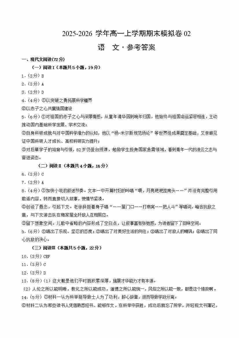 高一语文上学期期末模拟卷02(新教材统编版)(参考答案)