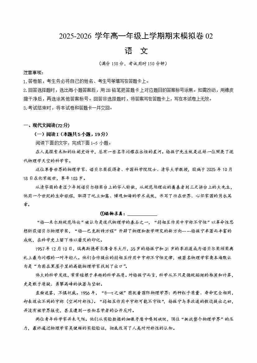 高一语文上学期期末模拟卷02(新教材统编版)(考试版A4)
