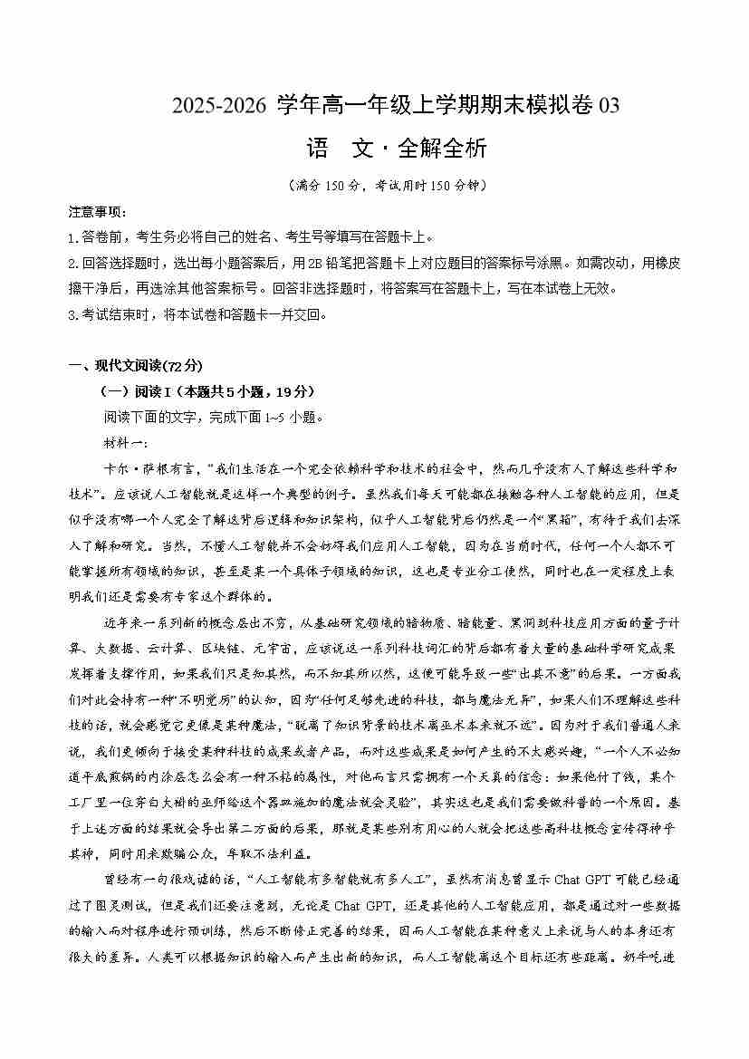 高一语文上学期期末模拟卷03(新教材统编版)(全解全析)