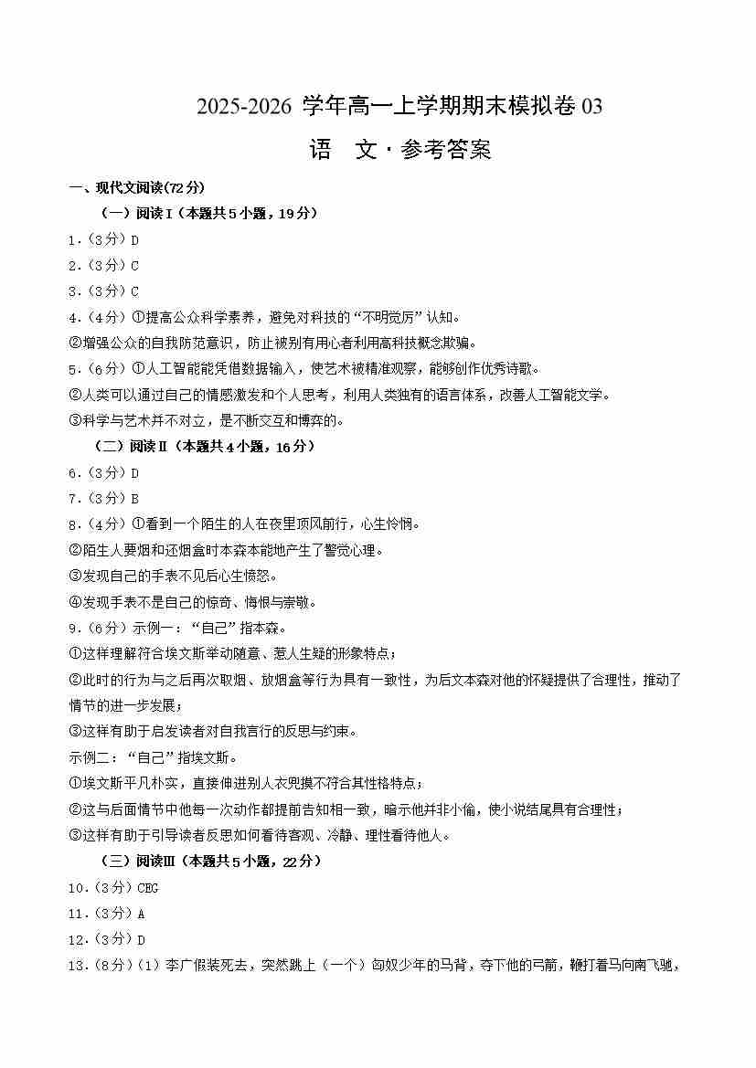 高一语文上学期期末模拟卷03(新教材统编版)(参考答案)