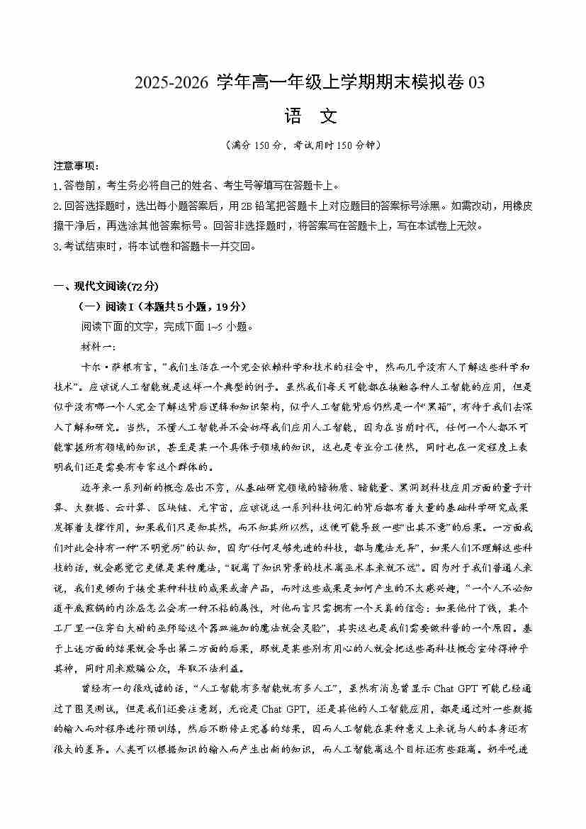 高一语文上学期期末模拟卷03(新教材统编版)(考试版A4)