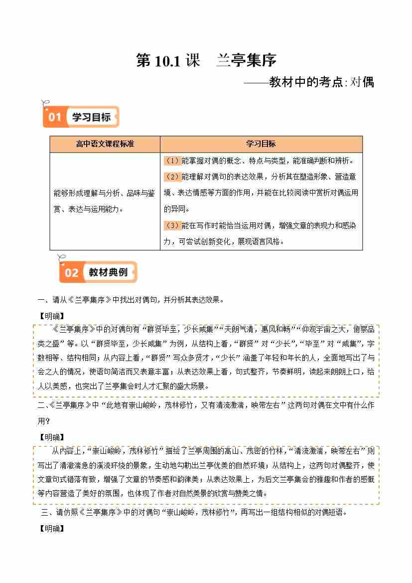 第10.1课 兰亭集序(教材中的考点:对偶)(学生版)