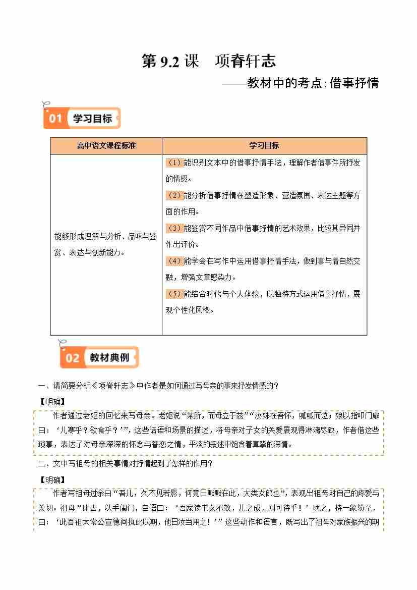 第9.2课 项脊轩志(教材中的考点:借事抒情)(学生版)
