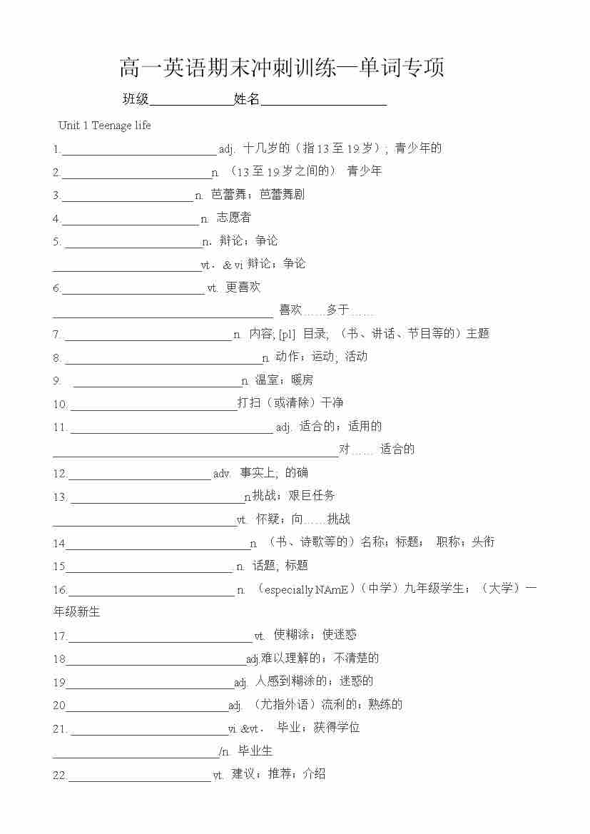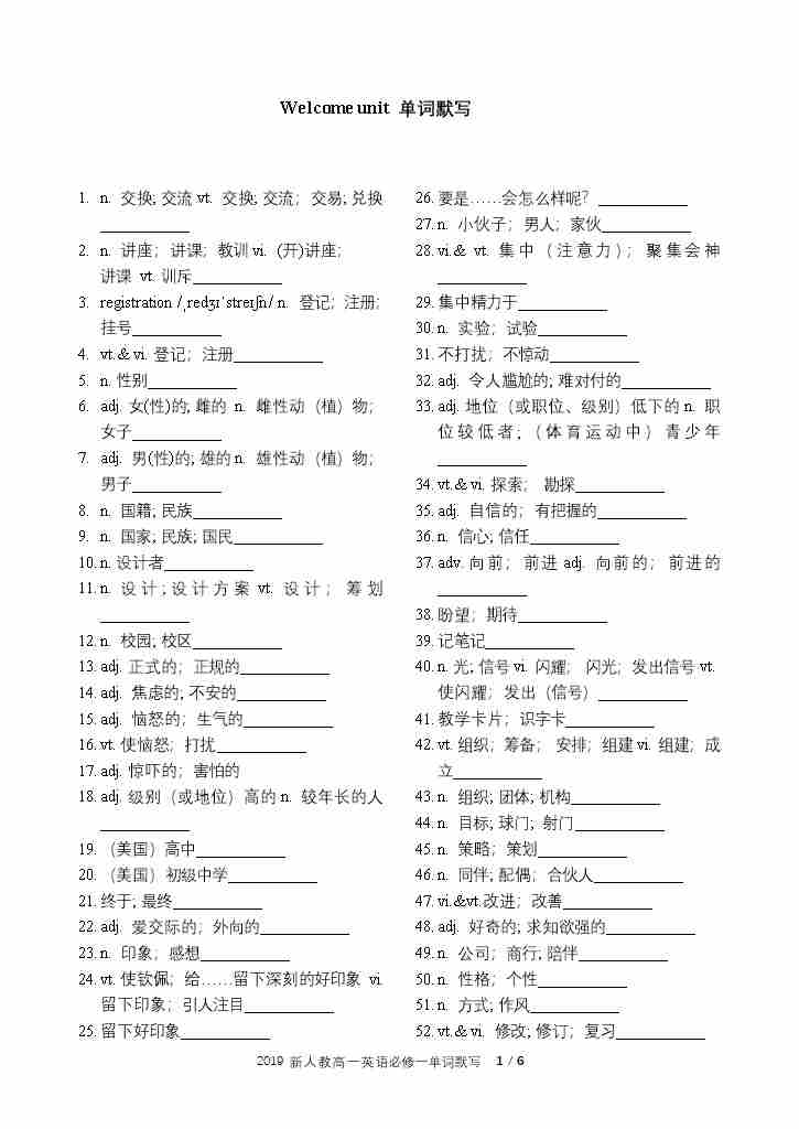 人教版必修第一册 高一英语新教材词汇表 默写版