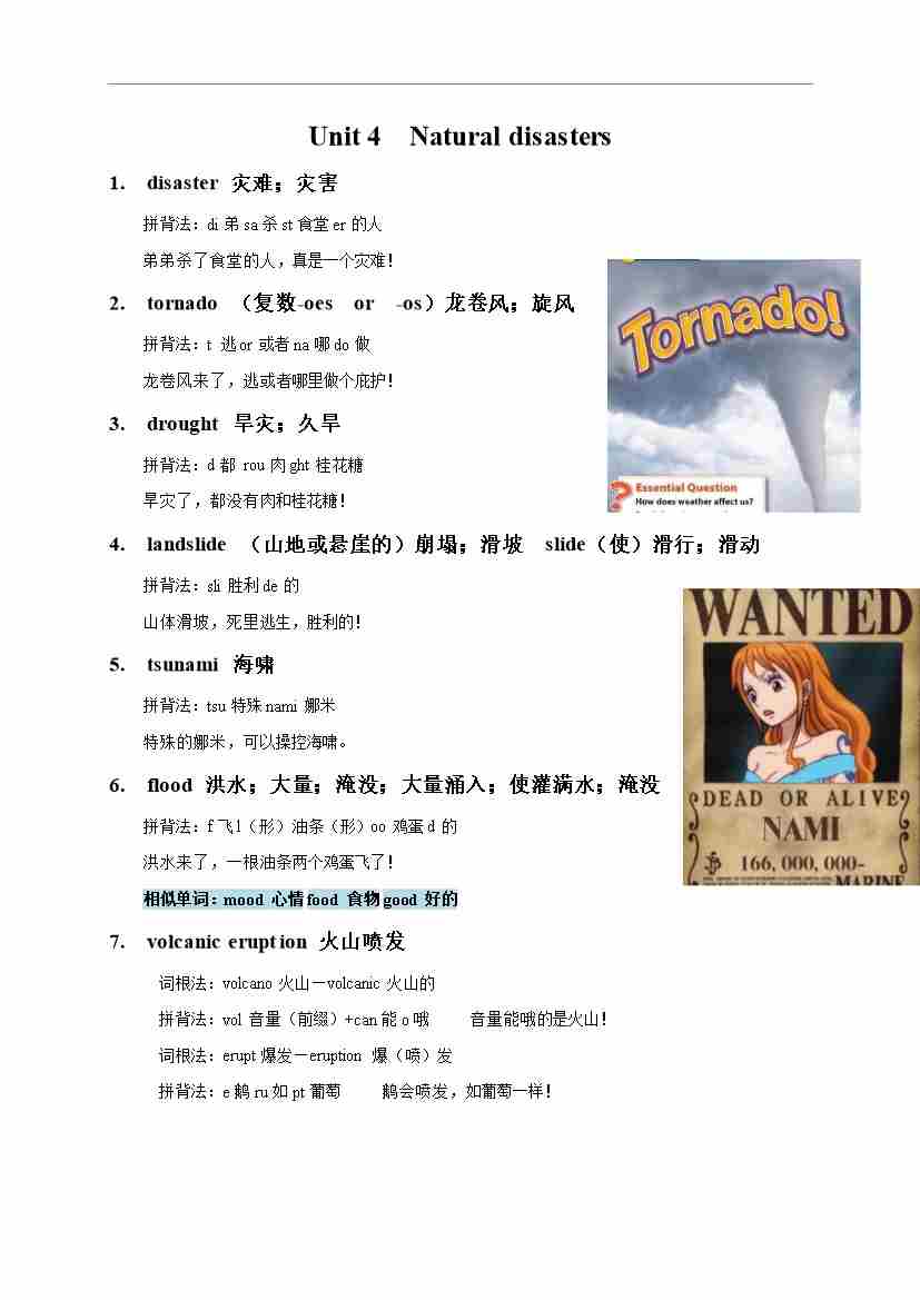 Unit 4 Natural disasters-【快乐背单词】高一英语单词暑假巧记妙背(2019人教版必修第一册)