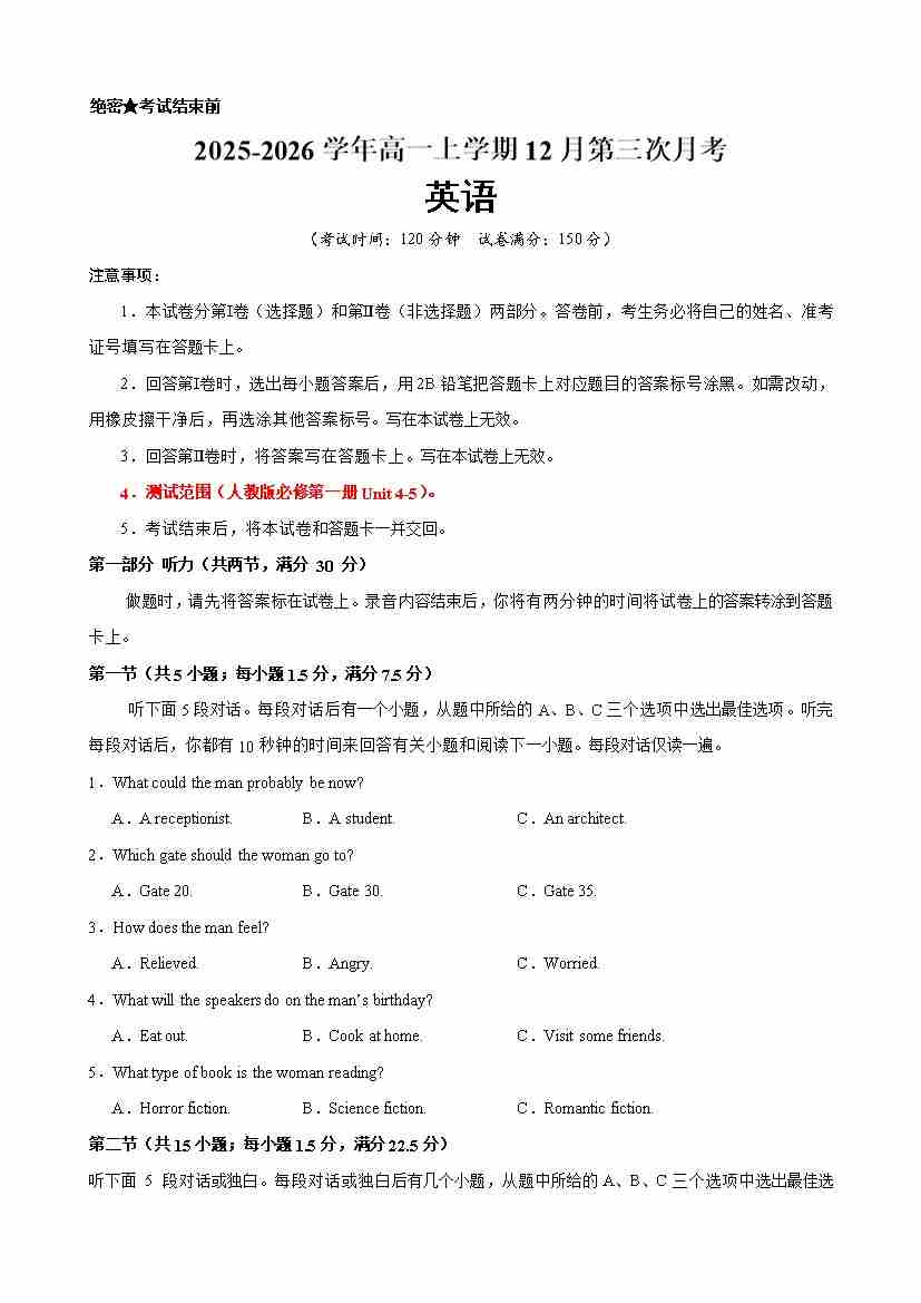 英语上学期12月第三次月考(人教版专用)(测试范围:必修一Units 4-5)(原卷版)