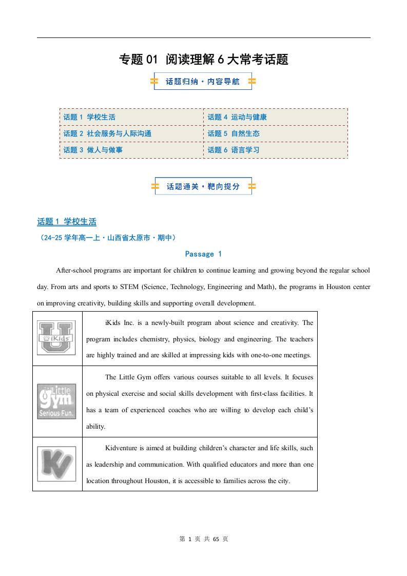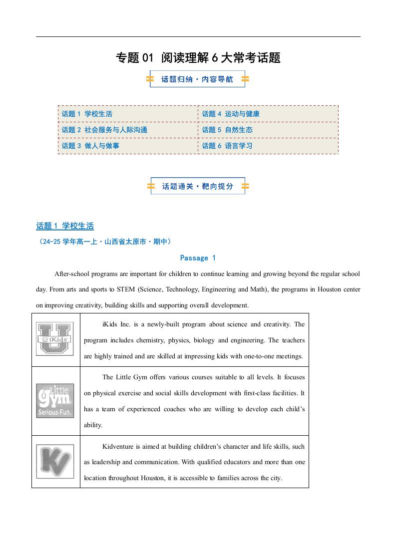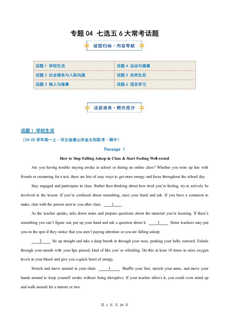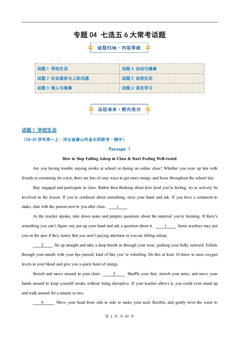 考前押题01 阅读理解6大常考话题(期中专项训练)(原卷版)1