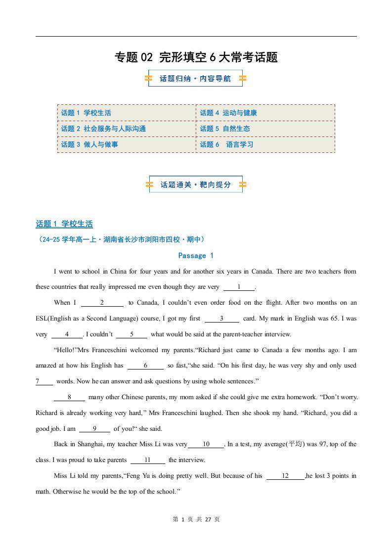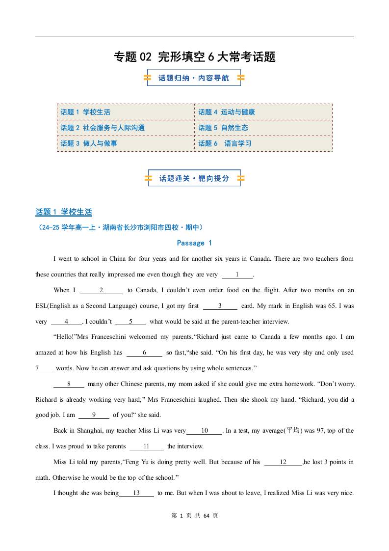 考前押题02 完形填空6大常考话题(期中专项训练)(解析版)2
